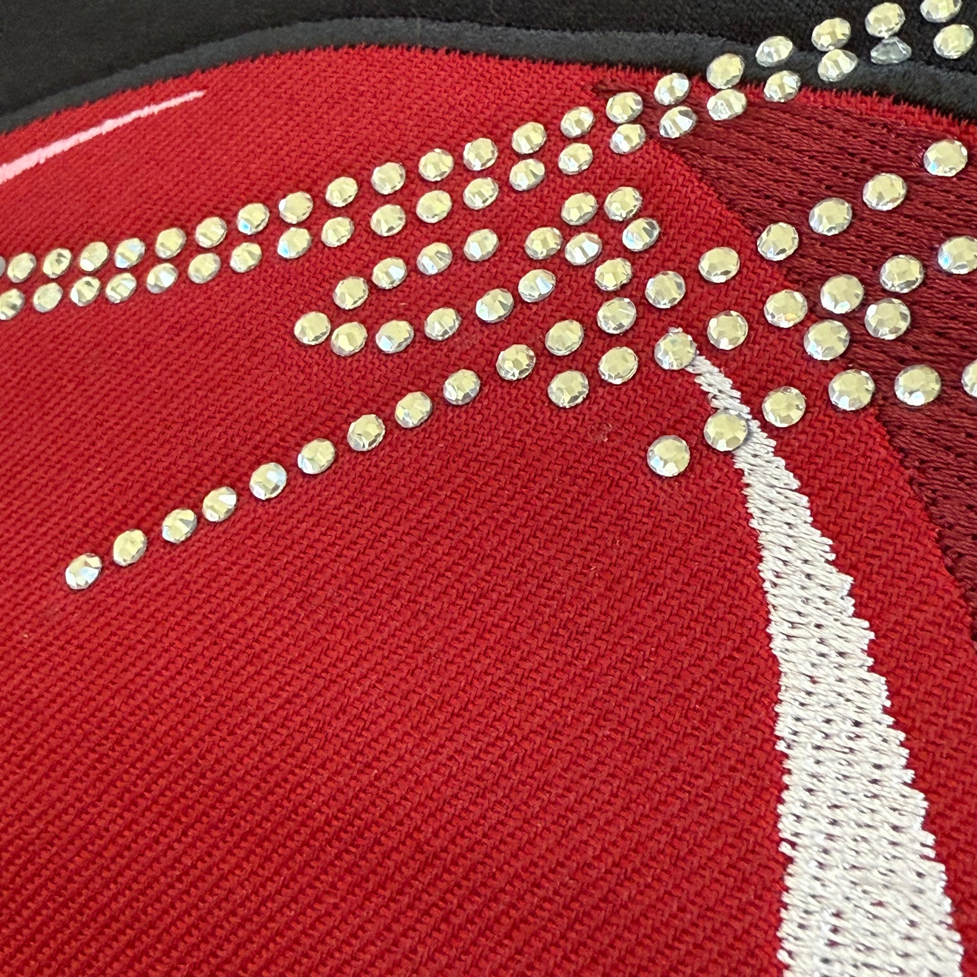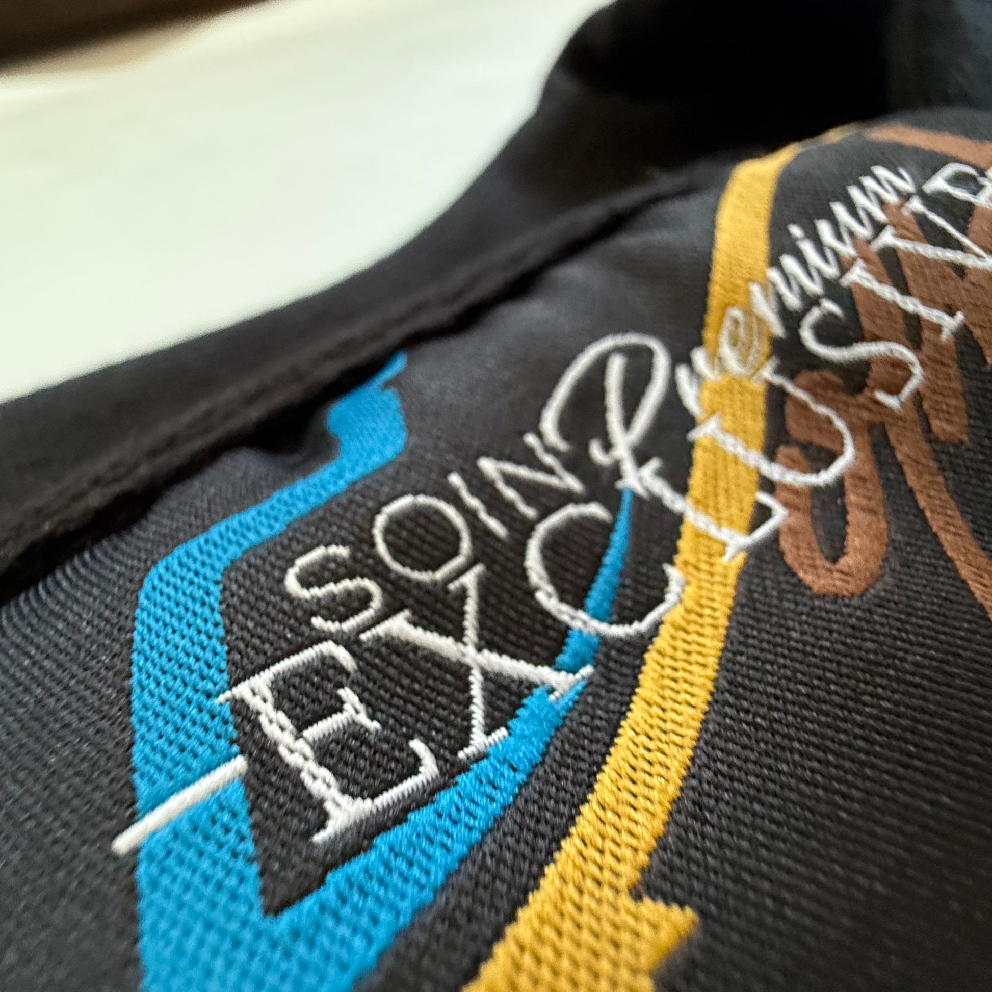 Camisa negra premium con gramaje alto y un bordado ilustrativo de la paleta derritiéndose y el logo Soin en rhinestones, combinando dos técnicas para crear una pieza llamativa y totalmente artística.