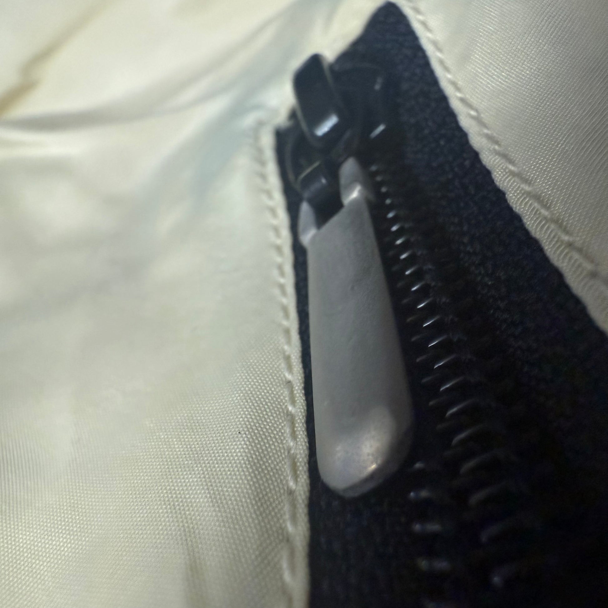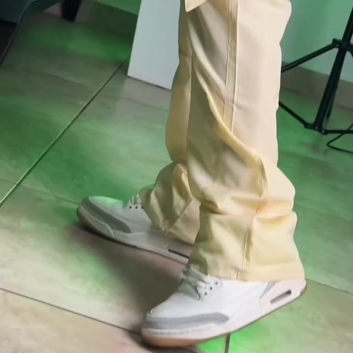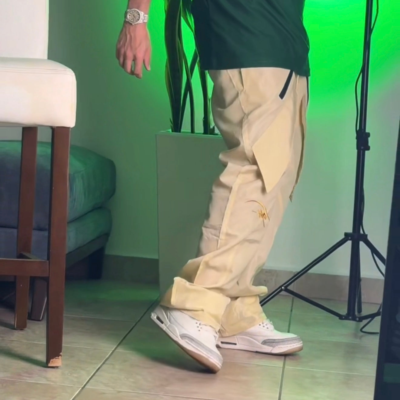 Un pantalón crema en nylon con un diseño extravagante y moderno. Ideal para un look urbano audaz, con detalles únicos que incluyen texturas y cortes inesperados, creando una pieza llamativa y llena de estilo.