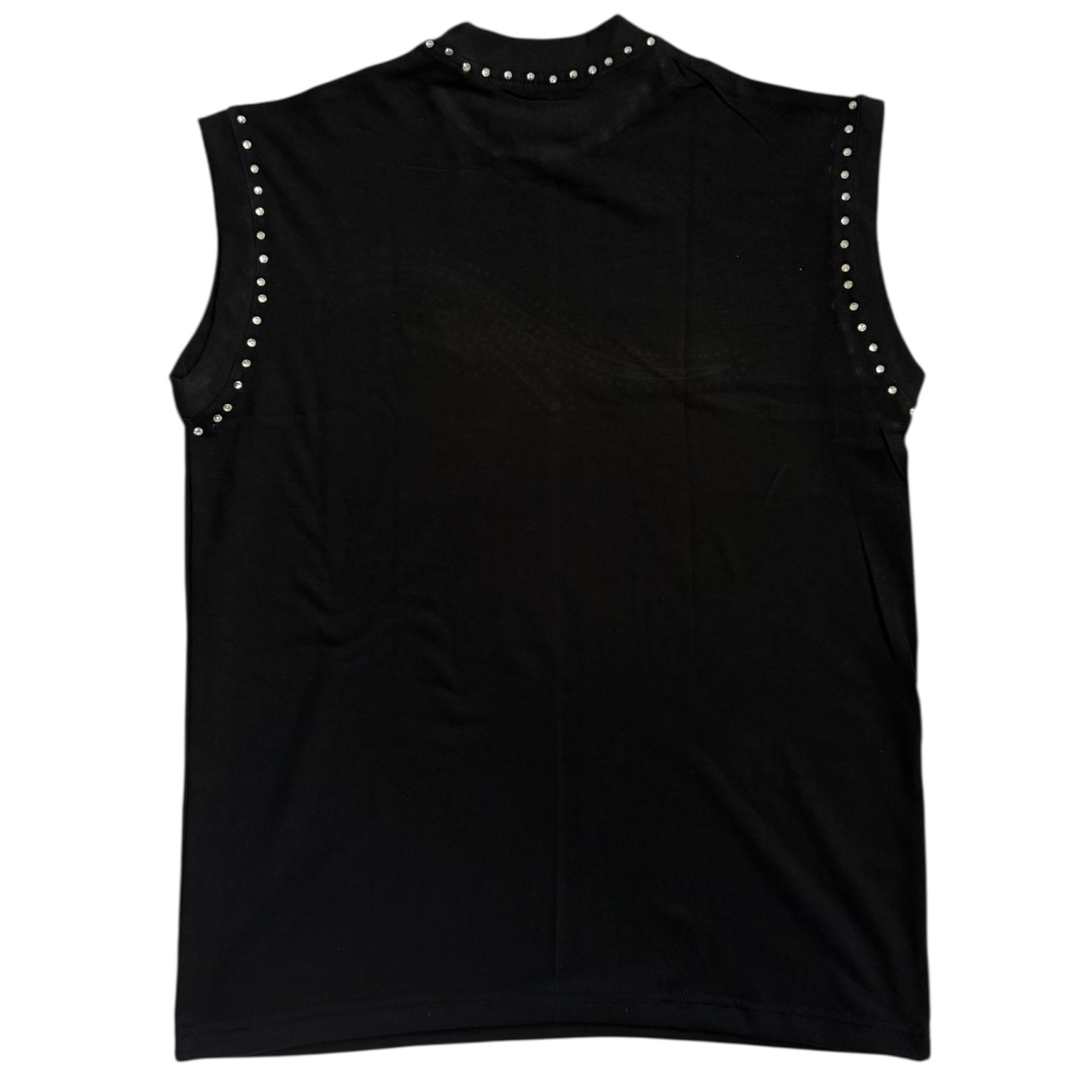 Camisa negra sin mangas con diamantes en los bordes, logo bordado en negro con outline negro, relleno en diamante lineal oscuro y un borde exterior en fila de cristal blanco que le da un brillo limpio y elegante.