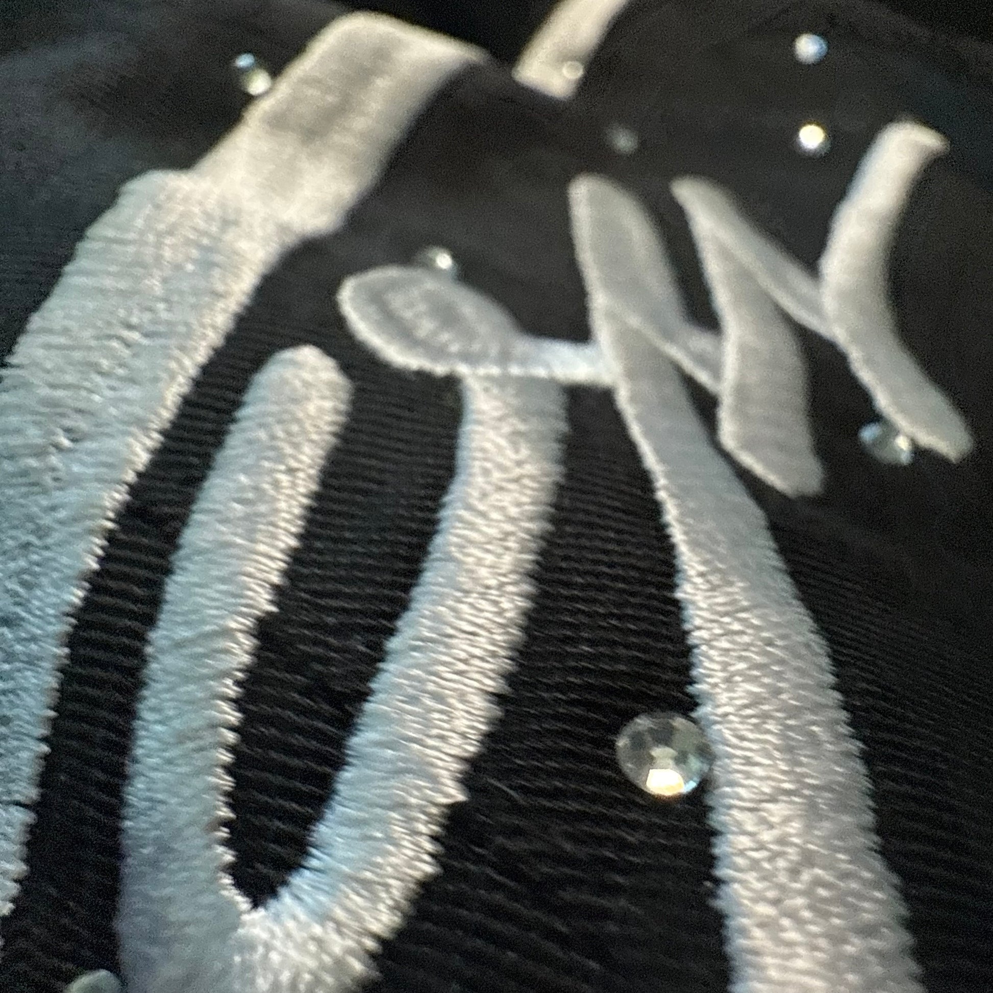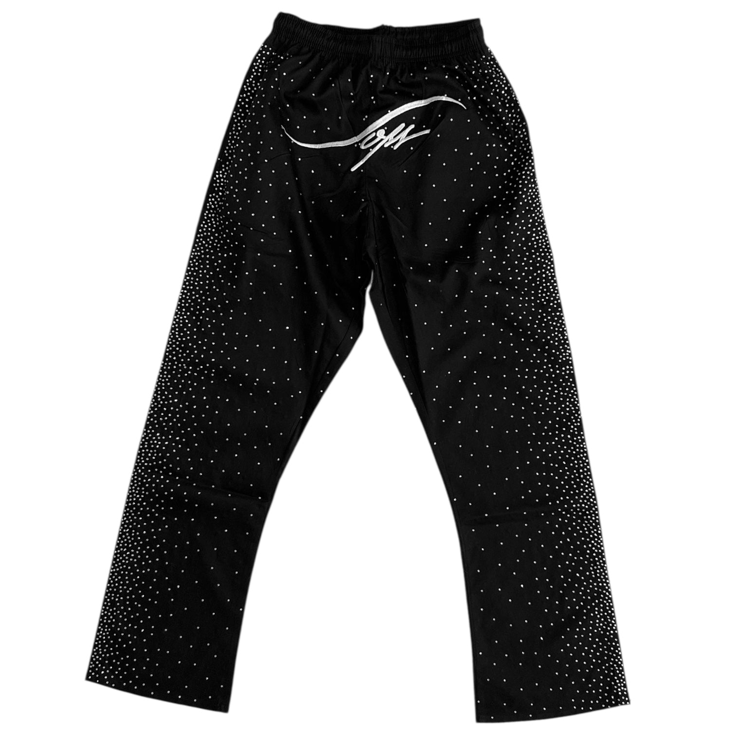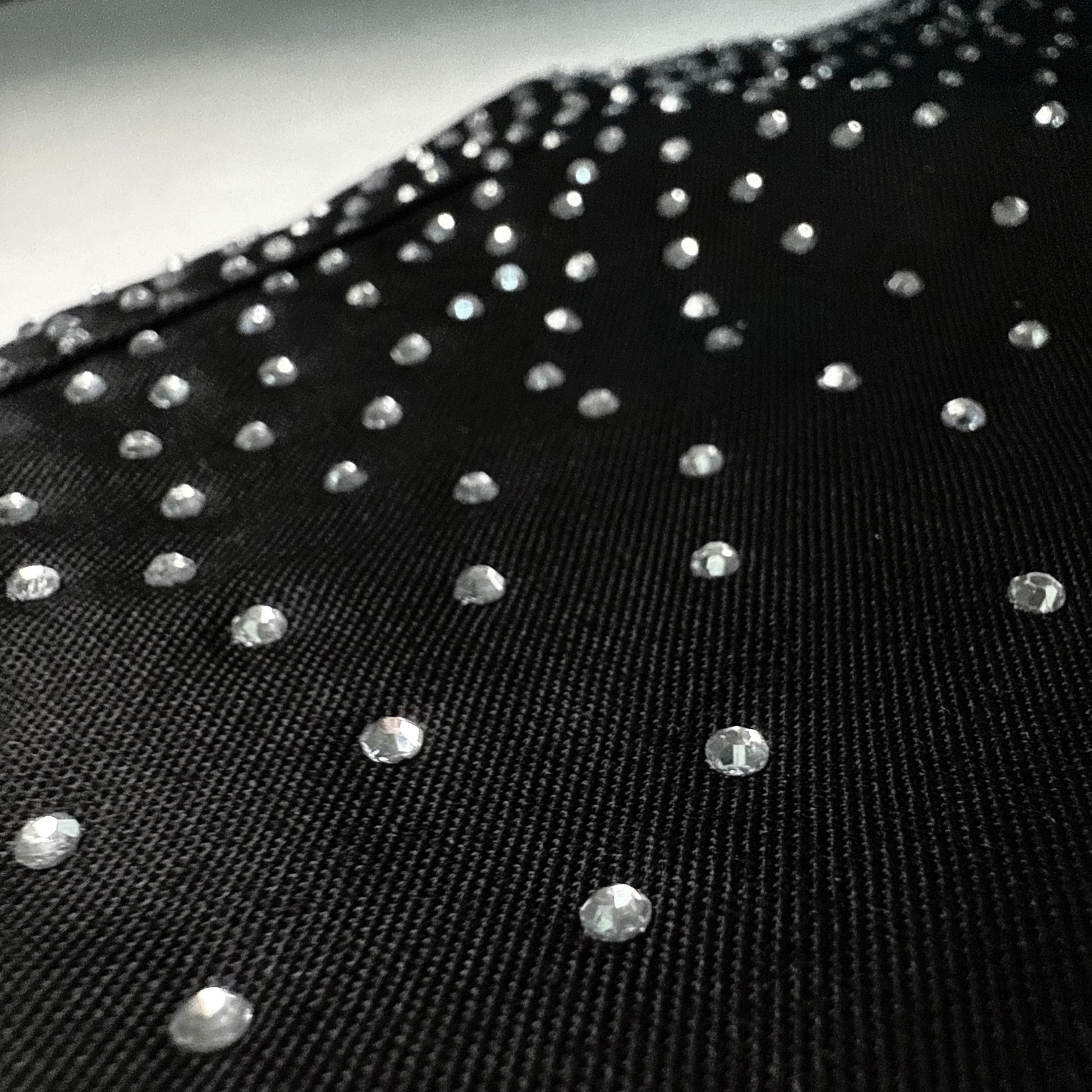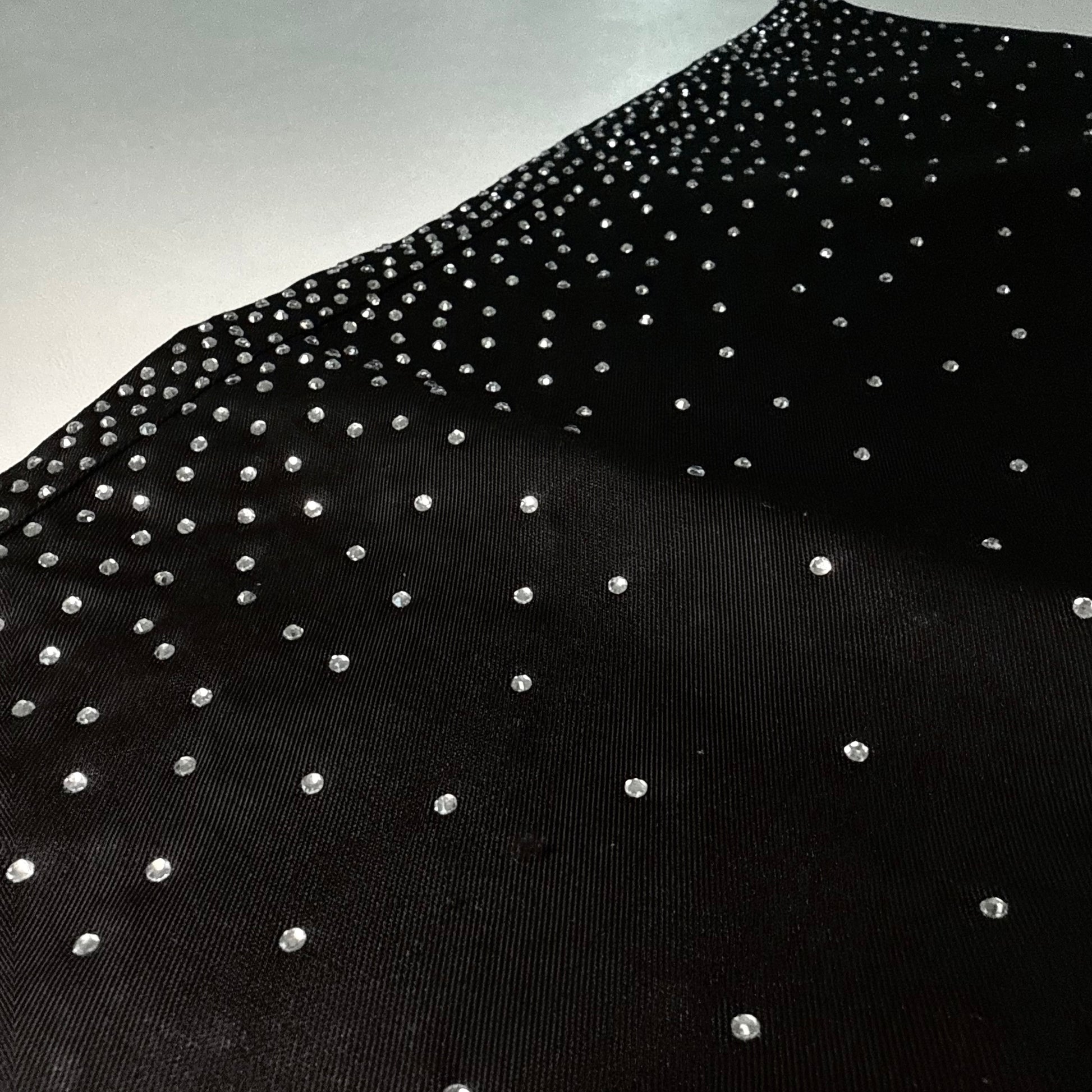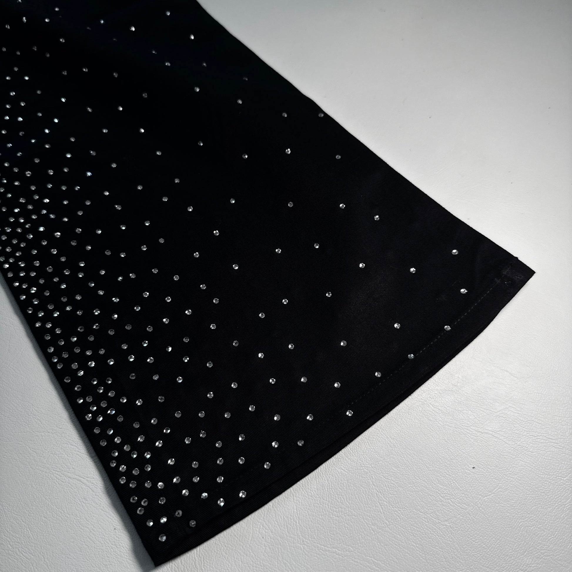 Mahón negro con un efecto vertical en diamantes degradado desde la cintura hasta el ruedo, al frente y atrás, creando un brillo único y un toque exclusivo que eleva cualquier outfit.