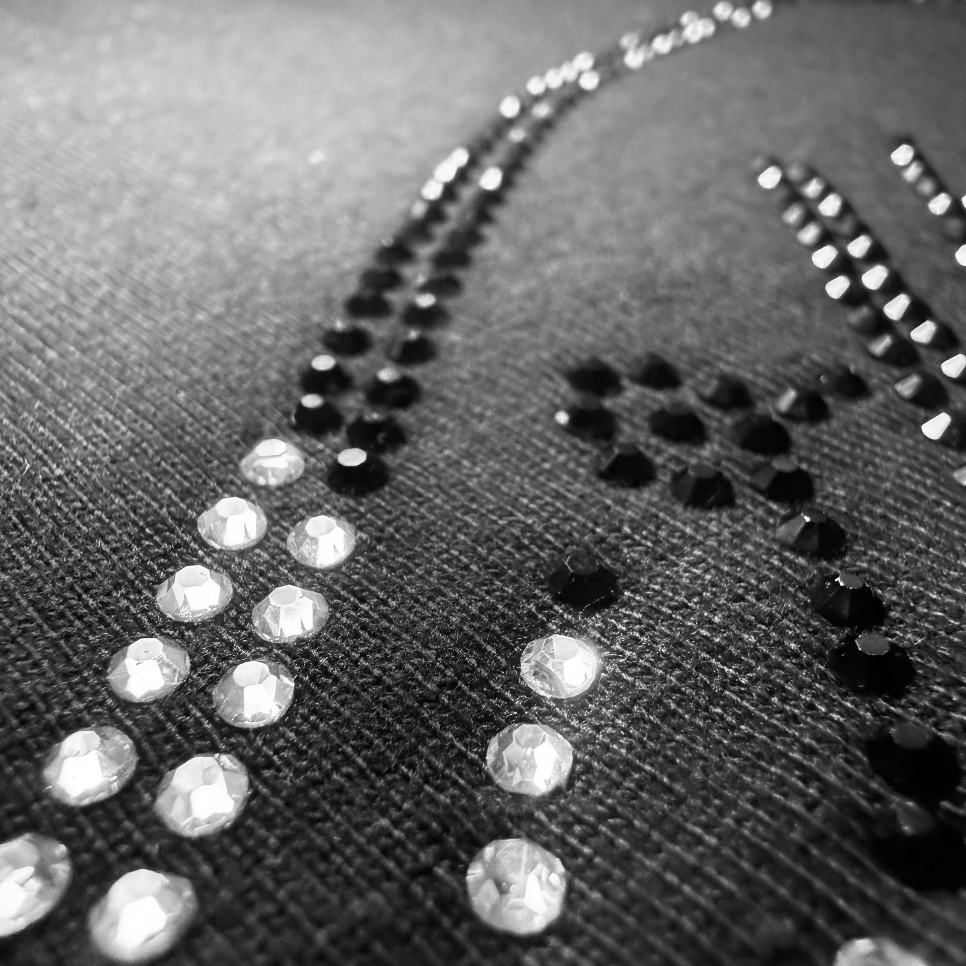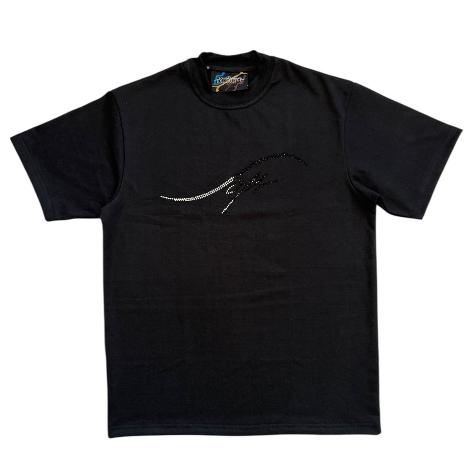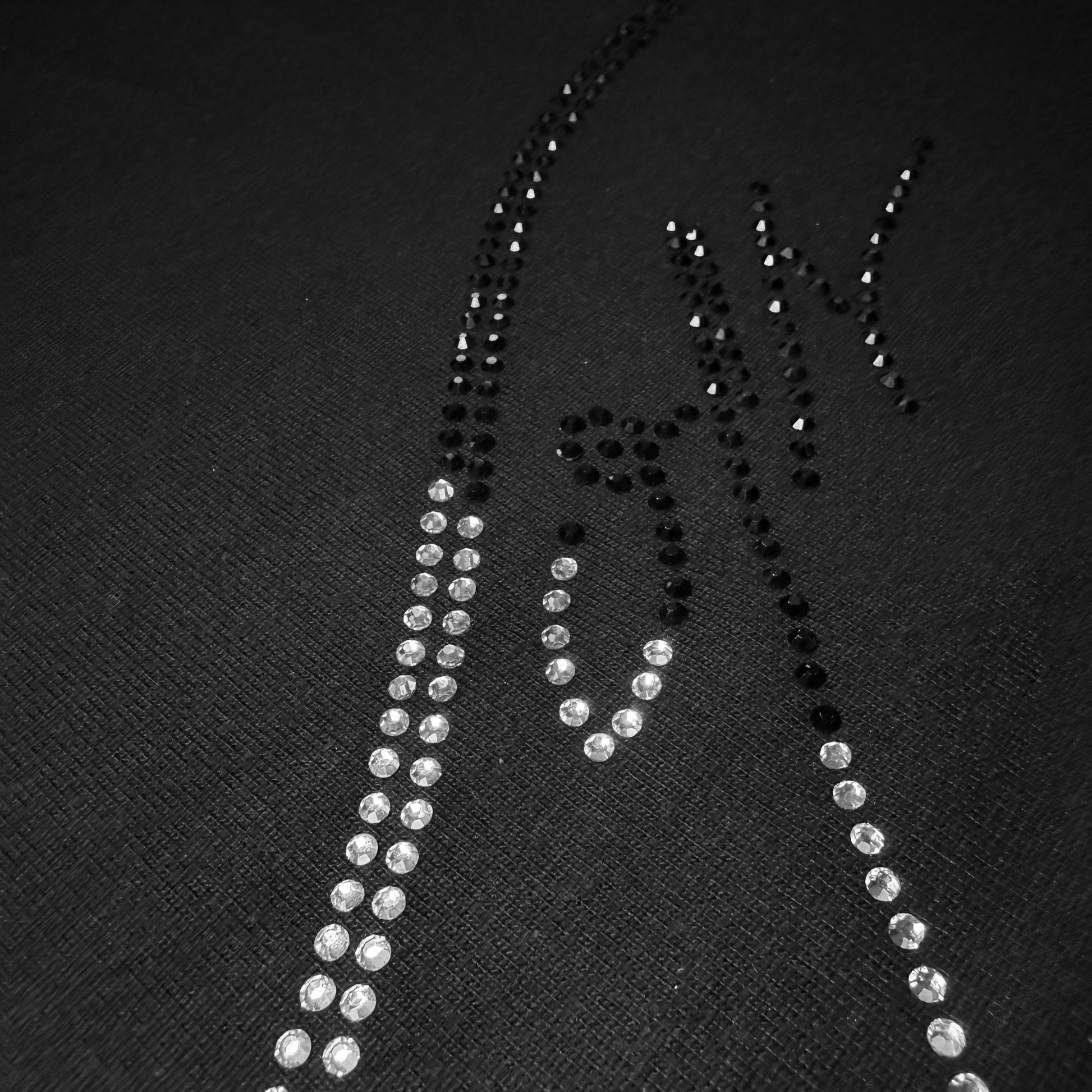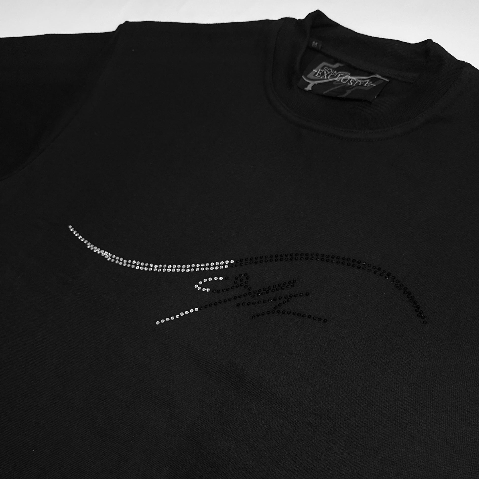 Camisa premium con nuestro logo en rhinestones doble línea, dividido en cristal blanco y negro, creando un contraste elegante que ilumina el outfit con un brillo exclusivo.